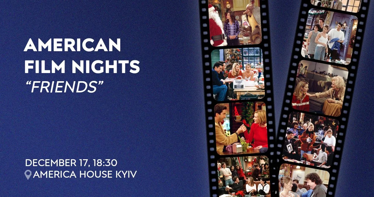 Join us for a screening taking place at America House Kyiv and participate in a discussion about the importance of family, friendships, and traditions in navigating life’s challenges and joys in three festive episodes of the beloved sitcom “Friends” (1994–2003), from directors Gary Halvorson and others, showcasing heartfelt and humorous holiday moments.